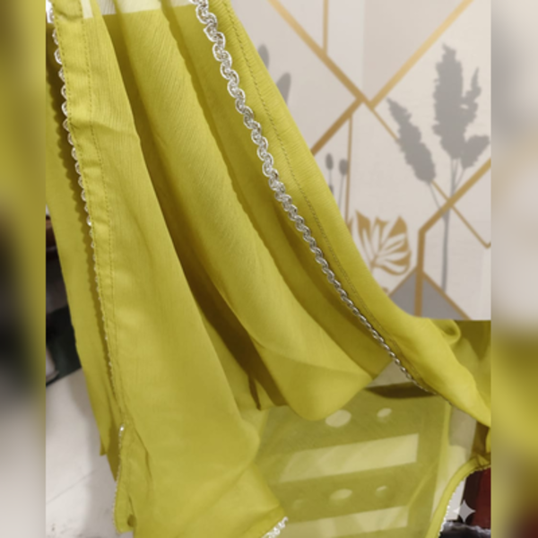 Discover timeless elegance with this pure chiffon dupatta. Crafted from beautifully sheer, flowing fabric, it offers an ethereal drape and a luminous quality that catches the light. The dupatta?s delicate edges are finished with classic tassels for a graceful fall. A versatile and essential accessory, it lends a touch of fluid sophistication to any outfit, making it perfect for festive occasions, formal gatherings, or elevating your everyday ethnic wear.